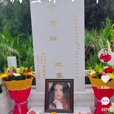 于月仙的墓是夫妻合葬墓,墓碑上刻着她和张学松两个人的名字。墓碑前摆放着于月仙的遗照,选择的是她年轻时候的照片,披散着一头秀丽卷发,肤白貌美气质出众。案台上还放着许多水果,还有她爱吃的零食。